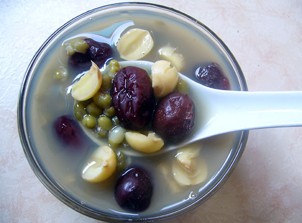 用料:红枣(去核)15克、绿豆20克、黄豆40克、白糖50克、清水适量。