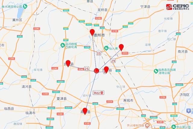 震中距平原县8公里、距武城县25公里、距陵城区29公里、距德城区33公里、距高唐县36公里,距德州市31公里,距济南市82公里。