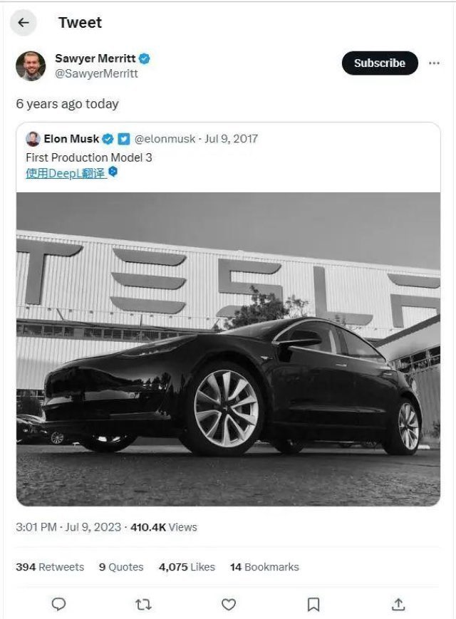 毕竟Model 3最早于2017年上市,在如今新能源汽车品牌几乎一年一款新车的节奏下,综合实力的确有点不够看了。7 月 9 号,马斯克还发文纪念当天是第一辆量产 Model 3 正式下线的 6 周年。