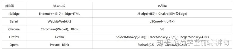 - 浏览器的内核是指支持浏览器运行的最核心的程序,分为两个部分的,一是渲染引擎,另一个是JS引擎。渲染引擎在不同的浏览器中也不是都相同的。