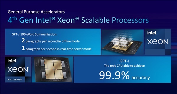 此外,Intel还首次提交了至强CPU Max处理器的MLPerf测试结果,其集成最多64GB HBM3高带宽内存,对于GPT-J而言是唯一能够达到99.9%准确度的CPU,非常适合精度要求极高的应用。