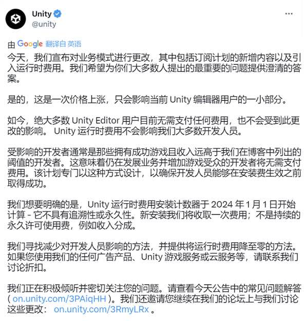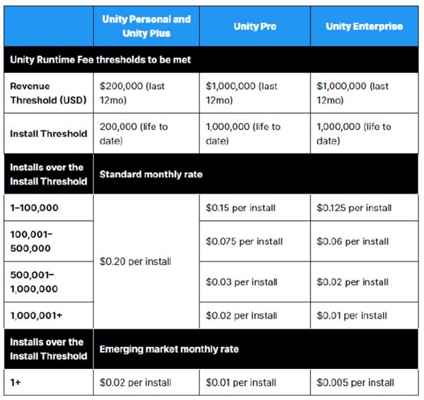 自 2024 年 1 月 1 日起,如果是使用 Unity 引擎开发的游戏,在收入达到一定阈值后,Unity 官方将按照“ 玩家的安装下载次数 ”,向开发者收取费用。
