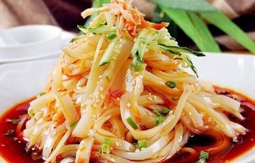 凉皮是陕西一种非常具有地方特色的风味小吃,尤其在关中各城镇大街小巷的饮食摊点上极为普遍。它以筋、光、辣香、清凉等特点,深受人们的青睐。