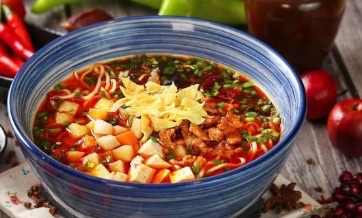 西安臊子面是中国陕西省西安市的特色传统面食之一、是著名的西府小吃,该菜品在陕西关中平原及甘肃陇东等地方流行。臊子面历史悠久,其中含有配菜比如豆腐,鸡蛋等,做法简单。臊子就是肉丁的意思。对于陕西人来说,臊子面的配色尤为重要,黄色的鸡蛋皮、黑色的木耳、红色的胡萝卜、绿色的蒜苗、白色的豆腐等材料,既好看又好吃。