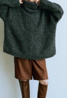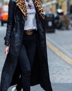 皮大衣帅气又拉风,尤其是黑色的皮大衣,内搭毛衣+牛仔裤,配上一双尖头米白色靴子,简约时髦。