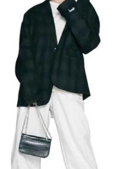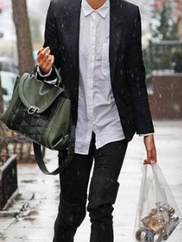 黑色的尖头长靴搭配一件黑色西装外套,显得十分帅气,你心动了吗?剪裁得体的西装,内搭一件白色衬衫,展现满满的中性风格。手上再搭配一个绿色的手提包,帅气中带着优雅。