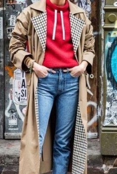 白色靴子搭配长款卡其风衣,拉风帅气,内搭红色卫衣,下装搭配基础款的牛仔裤,简约时尚,小部分的红色为沉闷的冬季增添一抹生机,更显俏皮。