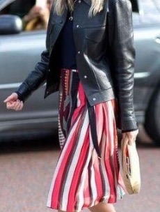 冬天,不少女生喜欢穿裙子,高腰条纹红色半裙搭配米白色靴子,修饰出一双大长腿,外搭短款皮衣,既有女性柔美的一面,又不失帅气。