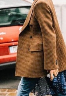 灯芯绒的驼色外套尽显复古气质,搭配米白色靴子+牛仔裤,时髦简约,如果想要个性一点,还可以内搭一条不规则的波点碎花裙,尽显个性。