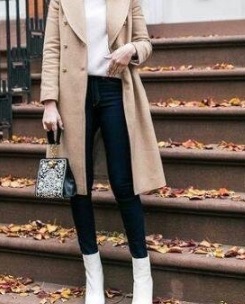 9、米白色靴子+白色毛衣+黑色裤子+驼色大衣