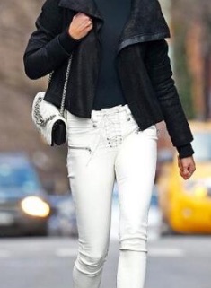 6、黑色尖头靴+白色裤子+黑色短款外套