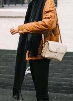 黑色的尖头靴搭配一件短款外套,显得帅气干练,你心动了吗?Pick一条黑色围巾,带着慵懒感,优雅又有女人味,轻松展现你的大长腿。肩上搭配一个浅色包包,提高了整体的亮度,使整体的搭配不再单调。下装选一条黑色的裤子,和围巾形成同色,简约又有整体感。