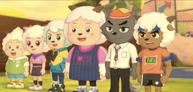 32、快看!我的棒棒糖真像一个小风车,彩色的包装纸上印有一些字,还有喜羊羊与灰太狼的图案。