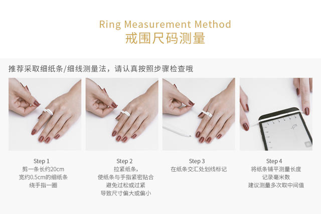 如果平时有戴戒指的习惯,可以测量现有戒指或旧戒指的直径。不过,平时做配饰用的戒指常会戴在中指或食指,尺寸和无名指会有差距,购买时可以咨询一下导购。【足记网】