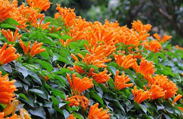 炮仗花也是一种开花比较个性的植物,因为它开花的时候一串一串,枝条垂下来就像鞭炮一样,红红火火的非常的美,他生长速度非常的快,爬藤能力非常的强,如果想养可以找一面墙栽上几棵,一年的时间就能够爬满。养它也是要保证光照充足,缺光枝条徒长,叶间距拉大,根本就不会开花,它主要的花期是在春季,春季一次就能够开爆,而且整面墙上几乎看不到叶片。