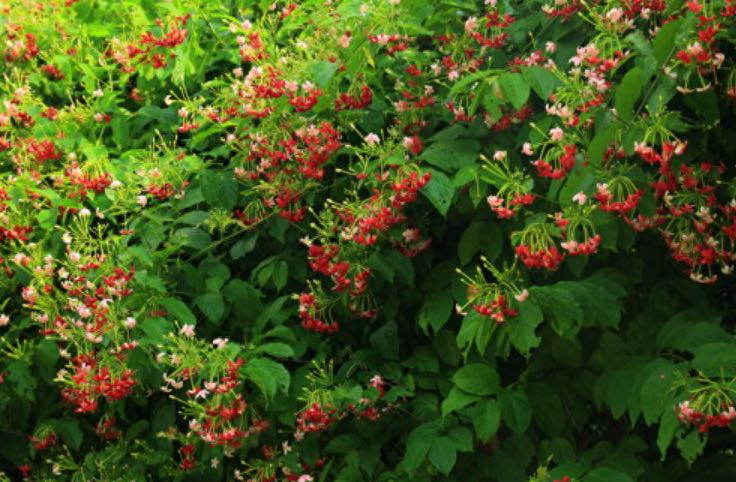 使君子是一种比较冷门的藤本植物,攀爬性能非常的强,小齐去年的时候栽种了一棵,栽到花棚里靠墙栽种的,一年的时间将整个墙爬满,而且棚顶也长的满满的,它的花期主要是在夏秋两季,开花的时候一穗一穗,红颜色非常的美,也有白色的品种,不如红颜色的好看,您也可以去选择一下,它的养护也是非常简单的,但是必须要求光照充足,肥料如果苗子足够大,你只需要用上充足的磷肥,就能够直接开花,开花如果授粉还能够结种子,种子挂在上面也是比较个性的,它如果在南方地区栽培,用不了一年就能够将整个墙面爬满,如果喜欢可以选择一下。