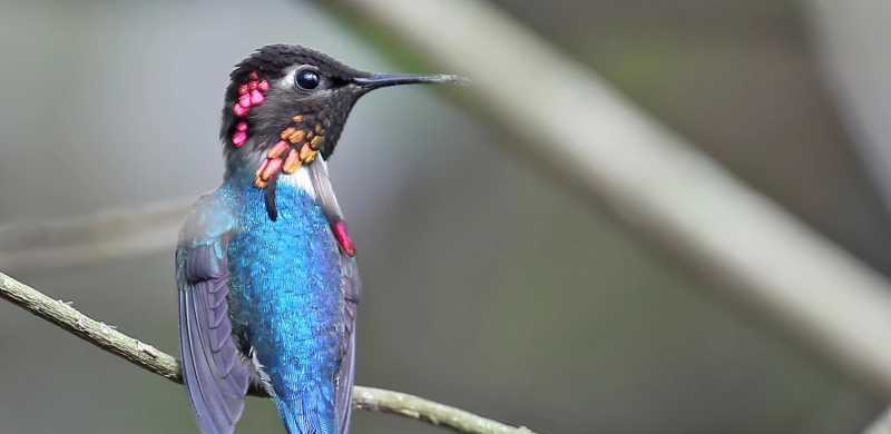 一只小小的雄性吸蜜蜂鸟栖息在树枝上