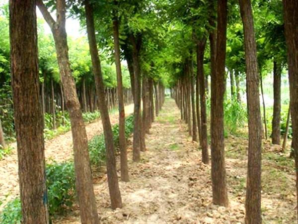 播种后、出苗前,土壤过于干燥时,可行侧方灌水。幼苗出齐后,4—5月间分二次间苗,按株距10—15cm定苗,每亩产苗6000—8000株。间苗后立即浇水。进入6月份,苗木开始速生,要及时灌水追肥。每隔20天施肥一次,每次每亩施硫酸铵5㎏或腐熟人粪尿400—500㎏,加2—3倍水施入。8月底停止水肥。生长季节要及时松土除草,亦可施肥。