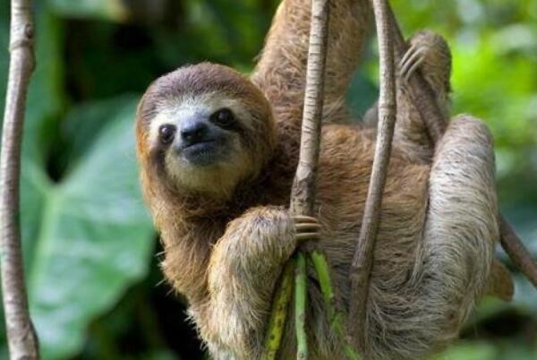 【树懒】树懒是严格的植食者,它主要吃树叶、嫩芽和果实,随便吃一点要用好几个小时来消化,吃饱了就倒吊在树枝上睡懒觉,能耐饥一个月以上,长久以往它想快都快不了,这也是树懒动作为什么那么慢的原因之一。
