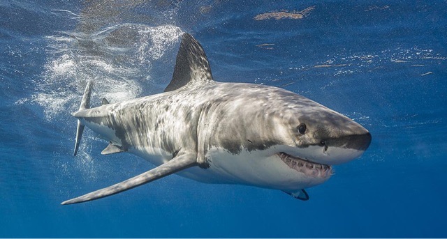 噬人鲨就是大名鼎鼎的大白鲨。它游泳速度平均3.2千米/小时,全力冲刺时可以跃出水面,是海洋中掠食性动物中体型最大的。它有特殊的拍尾巴行为,用尾鳍拍打水面,组织第二条大白鲨进食,也可以起到驱赶寄生虫的作用。