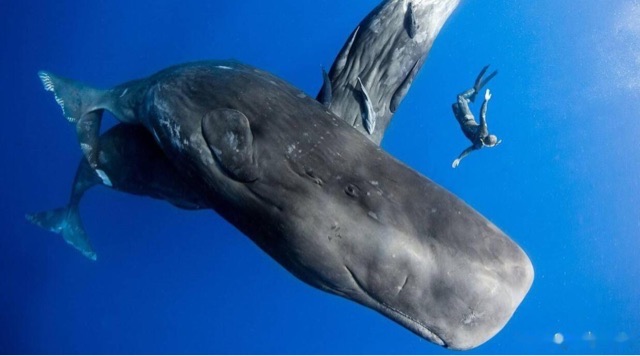 抹香鲸是世界最大的齿鲸,它们长可达18米,重超过50吨,除了战斗能力非常强之外,它的潜水能力几乎是所有鲸鱼中最厉害的,而且也是潜水时间最长的哺乳动物,它们能够下潜三千米左右的深海猎杀大王乌贼,这也是它最钟爱的食物,就整个身躯而言,抹香鲸的头部显得更大,而尾部却显得既轻又小,抹香鲸也是喜欢群居的动物,往往由少数雄鲸和大群雌鲸一起活动,它们广泛分布在世界的各个海域,由于潜水时间可达两个小时,人们很少看到它的身影。