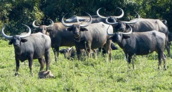 非洲野水牛,体长可以达到3.4米,身高可以达到1.7米,体重接近1吨,900千克,是整个牛科家族之中体型最大的种类之一。水牛的速度可以达到60千米每小时,而狮子的速度和耐力都不如水牛,如果被这牛角顶一下,立马肠穿肚烂。