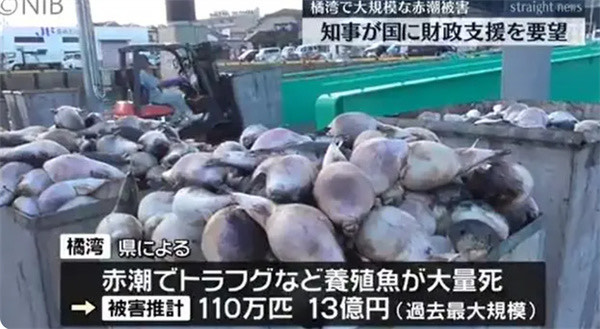 最近,根据日本媒体的报道可以了解到,日本长崎县7月末到8月上旬的期间一共有110万条河豚,大竹荚鱼等等养殖鱼类死亡,而且根据目前的估算,可以了解到损失额超过了13亿元,折合人民币6437万元左右。根据报道,可以了解到,长期县政府也是表示在海域发生了赤潮,海里面有大量的有害浮游生物,所以造成了大批鱼类死亡,而且这次造成的损失比较严重,可以说是史上最严重的情况了。日本水产厅也是表示,在过去的30年里面,日本一共发生过11次损失比较严重的赤潮灾害,这次也是其中的一次。