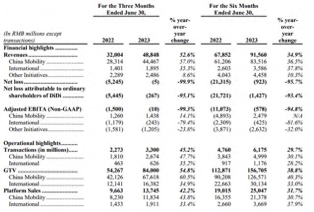 从财报中获取到,滴滴二季度核心平台交易量达 33 亿笔,同比增长 45.2%;中国出行业务板块交易量达 26.74 亿笔,同比增长 47.7%;国际业务交易额达到 6.26 亿笔,同比增长 35.2%;核心平台总交易额达 840 亿元,同比增长 54.8%;中国出行业务板块 GTV 达 676 亿元,同比增长 60.5%;国际板块 GTV 达 164 亿元,同比增长 34.9%。