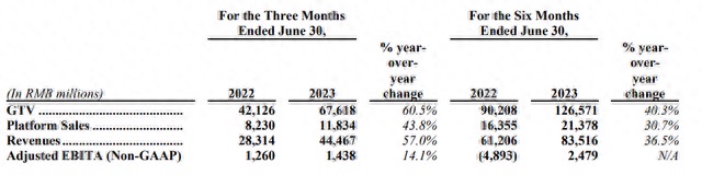 二季度中国出行及国际板块平台销售额达 137 亿元,同比增长 42.2%;中国出行平台销售额 11.8 亿元,同比增长 43.8%;国际板块平台销售额 19 亿元,同比增长 33.4%。