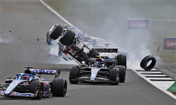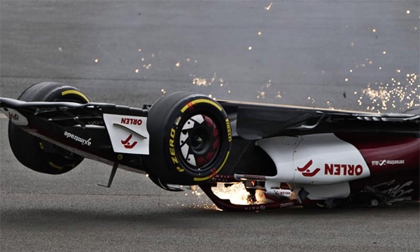 第九位发车的周冠宇与拉塞尔、角田裕毅、阿尔本、奥康陷入连环撞,其中加斯利与拉塞尔发生碰撞后,拉塞尔的赛车失控撞向周冠宇的赛车右侧,周冠宇的C42赛车被撞得直接翻转倒扣并高速滑向赛道外侧,经过砂石缓冲区弹起直接飞过了轮胎墙,极其罕见地卡在轮胎墙和铁丝网之间。