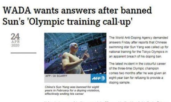 数天前,有媒体曝光了一份中国泳协内部文件,文件主要内容是组织国家游泳队员在4月至6月期间展开集训,这本来没什么,但名单上的孙杨引来很大争议,按照前的裁定结果,孙杨被禁赛八年,而且除非临近禁赛结束,不然孙杨是无法和国家队一起训练的,但软此后泳协宣布该集训文件作废,但WADA依旧要求泳协解释。