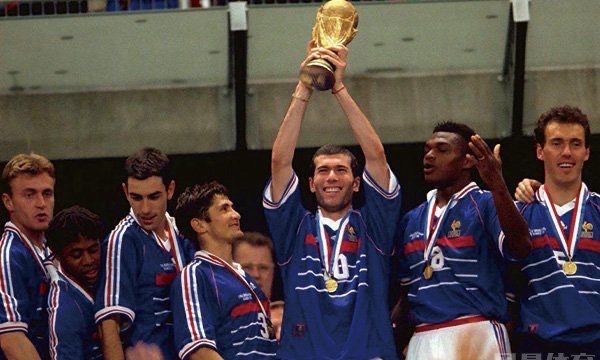 1998年世界杯冠军属于东道主法国队,在齐达内的率领下法国队决赛3-0大胜巴西队夺冠,首次摘得世界杯,28岁的齐达内正值职业生亚巅峰,他在场上的统治力令人惊叹。法国队的冠军阵容里除了齐达内,还有德尚、维埃拉、德尔卡夫、吉瓦尔什等是实力球员,这个阵容攻击力不强,主要依靠防守成功后的快速反击。