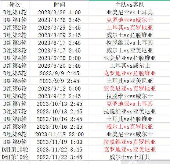 D组详细赛程表