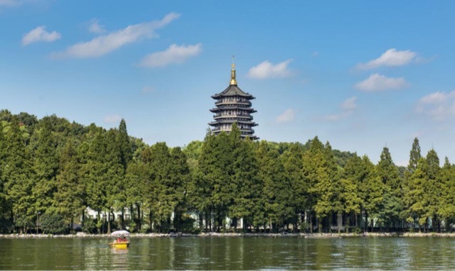 雷峰塔是位于浙江省杭州市西湖风景区的一座彩色铜雕宝塔,塔始建于北宋时期,后经过历代的重修在2002年正式重建,塔高约为71米,是“西湖十景”之一。
