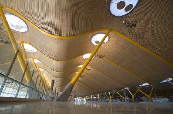 马德里巴拉哈斯机场,距离马德里市中心仅12公里。独特的波浪型屋顶,由中央支柱支撑,白天可吸收自然光线。与大多数机场配色中使用的标准灰色和白色相区别,明亮的红色和黄色传达出了热情好客的氛围。并且对于马德里的炎热的夏天来说,屋顶也提供了必要的遮阳功能。