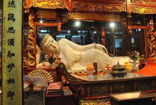 玉佛寺很出名的是清末普陀山慧根法师从缅甸请回的两尊玉佛,其实慧根法师一共请回5尊大小不一的玉佛,在返回普陀山的路上把其中的两尊留在了上海。【足记网】一尊在玉佛楼内,是高1.92米的释迦牟尼坐佛像,佛身上装贴的金箔和镶嵌的宝石光彩夺目,为“镇寺之宝”。在玉佛楼的天花板顶,还塑有镏金佛像500尊,进玉佛楼参观需要另付10元门票。另一尊在寺庙西侧的卧佛堂内,是长96厘米的释迦牟尼卧佛像,按照释迦牟尼80岁圆寂时的摸样打造,侧身而卧,右手支头,神态安详。卧佛的对面,近代由新加坡信徒捐赠,新增了一座长约4米的玉制卧佛。