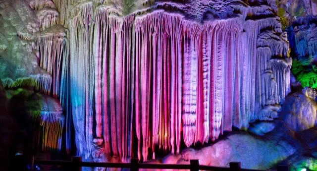 银子岩位于桂林市荔浦县,属于典型的喀斯特地貌,其溶洞贯穿十二座山峰,洞内汇集了不同地质年代发育生长的钟乳石,晶莹剔透,洁白无瑕,宛如夜空的银河倾斜而下,闪烁出像银子一样的光芒,所以称为“银子岩”。