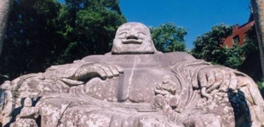 弥勒岩是福清的旅游宣传名片。弥勒岩由一块巨大的花岗岩雕刻而成,是宋代的福清本县人—吕伯恭的杰作。弥勒岩,整体高6.4米,宽8.9米,石像盘腿趺坐,袒胸露脐,左手捻珠,右手抚腹,两眼平视,双耳垂肩,笑容可掬,生动逼真,形神兼备,栩栩如生,旁边还有3尊小罗汉像作为陪伴。
