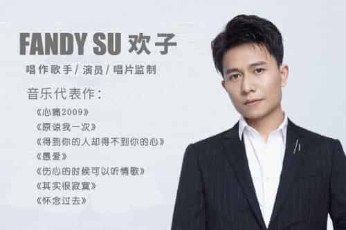 欢子(Fandy Su),1984年9月25日生于广东阳江,中国流行男歌手、演员、词曲创作人、音乐人、企业家、索吻时代公司创始人,毕业于星海音乐学院。2003年以一首《恋上你的滋味》出道,出道至今,相继发行了《愚爱》《得到你的人却得不到你的心》《其实很寂寞》《我们回不去了》《新欢主义》等八张个人音乐专辑。2010年期间,《心痛2009》《原谅我一次》《其实很寂寞》《得到你的人却得不到你的心》等歌曲在华语乐坛大热,欢子排名常年跃居各大音乐排行榜前列榜首,专辑销量在内地唱片市场销量前三名。【足记网】2011年,以专辑《我们回不去了》荣获华语金曲奖优秀原创歌手奖和劲歌王最佳新晋歌手奖以及音乐先锋榜乐坛进步奖。2012年,以歌曲《天使也会哭》荣获华语金曲奖全国最受欢迎唱作人奖。2013年,以新歌《何必再拖》获得华语金曲奖全国最受欢迎创作歌手奖。2017年9月27日与模特刘璐在巴厘岛举办婚礼,婚后育有一女。2018年9月8日,欢子开启FANDYSU欢子·十年经典巡回演唱会。2021年,欢子新歌:《反正爱都爱了》、《无辜》、《嘴硬心软》等。2021年2月16日,欢子主演的电影《梦醒黄金城》上映。广东省阳江市阳江体育馆广东省阳江市阳江体育馆广东省阳江市阳江体育馆东莞市长安体育馆湛江市湛江奥体中心体育馆惠州市惠州江北体育馆广州市广州花都东风体育馆阳江市阳江国际会展中心