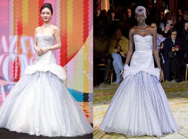 星光抹胸裙来自Viktor & Rolf 2023春夏高定,跟秀场模特的穿着效果相比,赵丽颖简直赢在了起跑线上。【足记网】