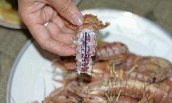 在将虾子扒开之后,可以看看虾头是不是一团的情况,假如是的话就是注胶虾,假如正常就是正常虾子,正常的头上带红。